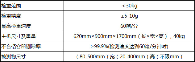 該設備適用于在線生產的整箱產品的在線自動稱重檢測、欠重檢測、漏裝檢測,附件缺失檢測等,廣泛用于飲料、食品、制藥、日化、電子、工業品、五金、軍工等產品凈含量苛刻的行業。產品別名:動態檢重秤、在線檢重機、自動稱重機。